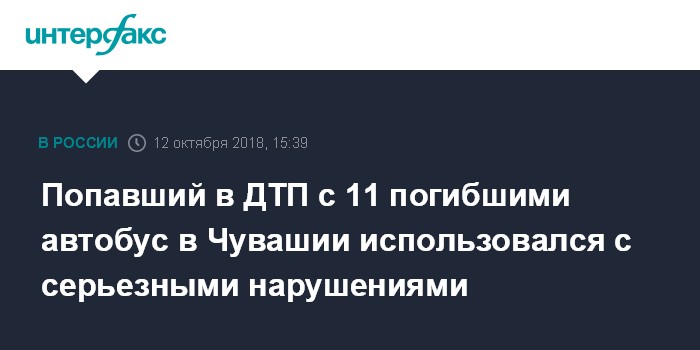 Москва. 12 октября. INTERFAX.RU - Автобус, 11 пассажиров которого погибли при столкновении с грузовиком в Чувашии, не прошел предрейсовый осмотр, на маршрут не была выписана путевка, а водителя не проверяли медики, сообщила официальный представитель Следственного комитета (СК) Светлана Петренко.