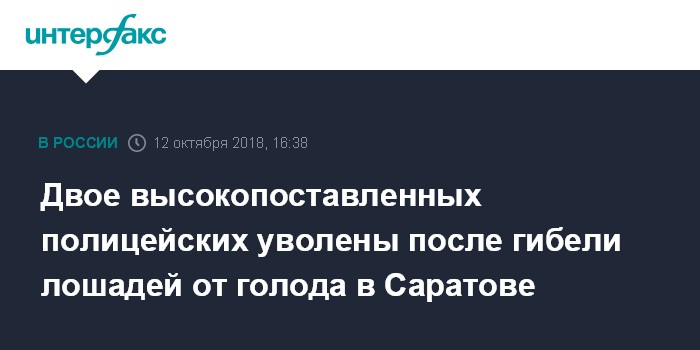 Москва. 12 октября. INTERFAX.RU - Двое руководителей подразделений в ГУ МВД Саратовской области освобождены от занимаемых должностей из-за вызвавшей широкий резонанс истории с погибшими от истощения полицейскими лошадьми, сообщается на сайте главка в пятницу.
