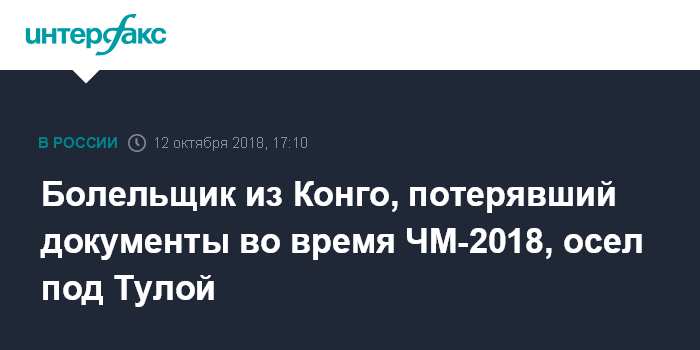 Москва. 12 октября. INTERFAX.RU - Болельщик из Конго, который в Москве во время чемпионата мира по футболу остался без документов и не смог вернуться на родину, нашел приют в Заокском районе Тульской области.