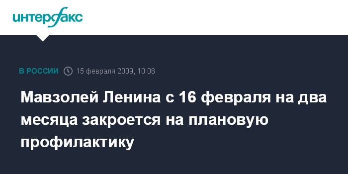 Москва. 15 февраля. INTERFAX.RU - Мавзолей В.И.Ленина на Красной площади с понедельника, 16 февраля, закроется на два месяца для проведения плановых профилактических работ.