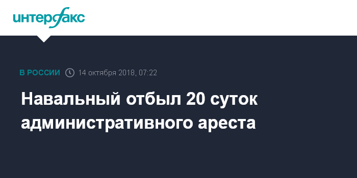 Симоновский суд Москвы 24 сентября признал Навального виновным в совершении административного правонарушения, предусмотренного статьей "Нарушение установленного порядка организации митинга, повлекшее причинение вреда здоровью человека или имуществу, если эти действия не содержат уголовно наказуемого деяния". Ему было назначено наказание в виде 20 суток административного ареста.