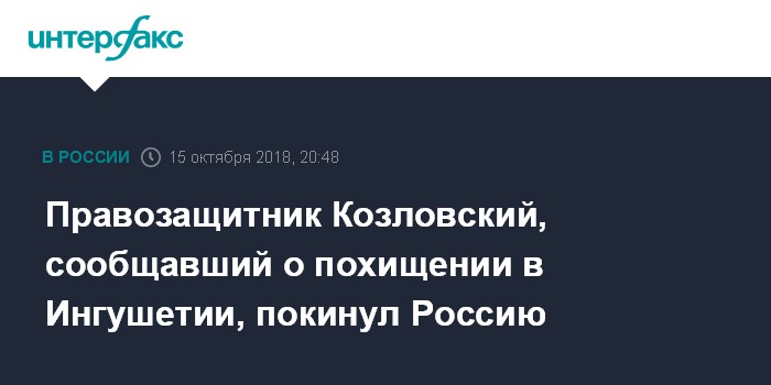"По имеющимся данным, Олег Козловский, направленный в Магас для мониторинга митинга против соглашения о границе и заявлявший об избиении и похищении в Ингушетии, покинул нашу страну вместе со своей семьей", - сказал собеседник агентства.