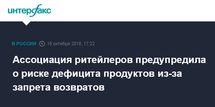 Москва. 16 октября. INTERFAX.RU - Введение запрета на возврат поставщикам продуктов, срок годности которых не превышает 30 дней, может привести к их дефициту. Так считает Ассоциация компаний розничной торговли (АКОРТ, объединяет крупнейших ритейлеров). Кроме того, скидок на такую продукцию станет меньше.