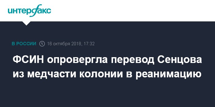 Москва. 16 октября. INTERFAX.RU - Ямало-Ненецкое управление Федеральной службы исполнения наказаний опровергло информацию СМИ о том, что отбывающий наказание украинский режиссер Олег Сенцов после голодовки находится в реанимации Лабытнангской больницы.