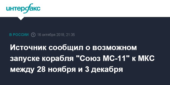 "Ведется подготовка к запуску корабля "Союз МС-11". Она не прекращалась, так построен производственный процесс. Обозначен диапазон в неделю: с 28 ноября по 3 декабря. Одну из дат в рамках этого диапазона определят баллистики и утвердит "Роскосмос", - сказал источник.