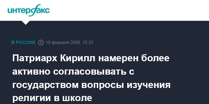 Москва. 15 февраля. INTERFAX.RU - Патриарх Московский и всея Руси Кирилл заявил о необходимости предпринимать более активные меры по взаимодействию с государством в вопросе преподавания в школе религиозных дисциплин.