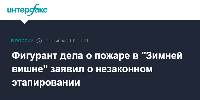Москва. 17 октября. INTERFAX.RU - Руководитель компании, обслуживавшей пожарную сигнализацию в сгоревшем кемеровском ТРЦ "Зимняя вишня", заявил о незаконной перевозке его из изолятора и препятствовании в подготовке к апелляции на свой арест, передает корреспондент "Интерфакс" из зала облсуда в среду.