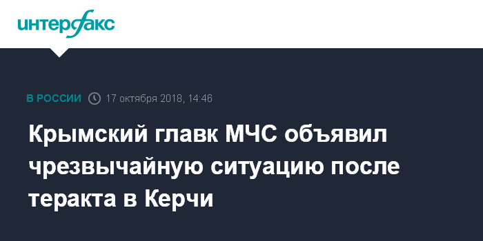 Москва. 17 октября. INTERFAX.RU - Главное управление МЧС по республике Крым объявило о чрезвычайной ситуации в связи с терактом в Керчи, сообщили на официальном сайте ведомства.