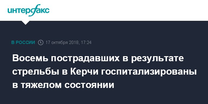 Москва. 17 октября. INTERFAX.RU - Восемь из 35 пострадавших в результате трагедии в керченском колледже находятся в тяжелом состоянии, сообщил глава Крыма Сергей Аксенов.