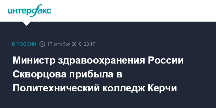 Москва. 17 октября. INTERFAX.RU - Глава Минздрава Вероника Скворцова поздно вечером в среду приехала в Политехнический колледж Керчи, передает корреспондент "Интерфакса". Она прибыла в Керчь несколько часов назад по поручению главы правительства РФ Дмитрия Медведева.