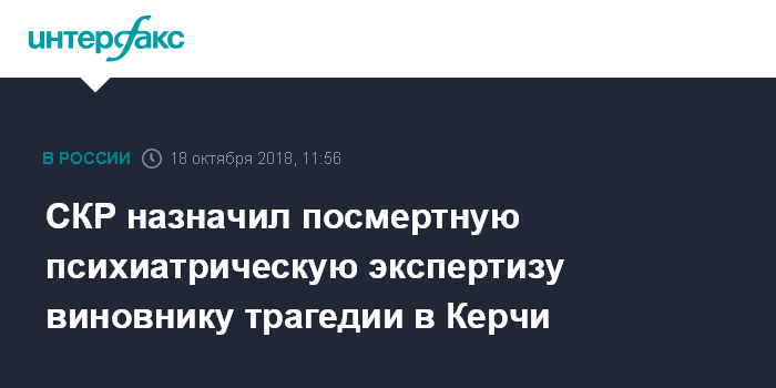 Москва. 18 октября. INTERFAX.RU - Следствие по делу о массовом убийстве в керченском колледже назначило посмертную психиатрическую экспертизу студенту Владиславу Рослякову, предположительно, совершившему это преступление, сообщила официальный представитель Следственного комитета (СК) Светлана Петренко.
