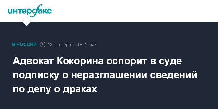 Москва. 18 октября. INTERFAX.RU - Защита футболиста Александра Кокорина считает незаконными действия следователя, взявшего с адвокатов подписку о неразглашении данных расследования уголовного дела, и намерены отменить ее через суд.