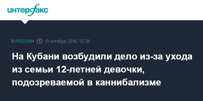 4 октября по подозрению в убийстве и употреблении в пищу человеческого мяса были задержаны 22-летний уроженец Алтайского края и 12-летняя девочка из Сочи, которая ранее ушла из дома.