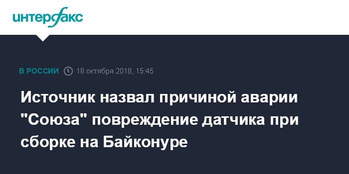 Москва. 18 октября. INTERFAX.RU - Ошибки при сборке ракеты "Союз ФГ" на Байконуре, возможно, допущенные специалистами РКЦ "Прогресс", могли спровоцировать аварию при запуске корабля "Союз МС-10" к МКС, сообщил "Интерфаксу" источник в ракетно-космической отрасли.