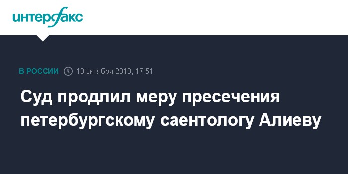 Москва. 18 октября. INTERFAX.RU - Санкт-Петербургский городской суд продлил меру пресечения одному из фигурантов дела петербургских саентологов Сахибу Алиеву до 19 февраля 2019 года. Об этом сообщил адвокат Алиева Иван Павлов, руководитель Команды 29. Ранее адвокаты Алиева сообщали о фальсификации постановления о привлечении Алиева в качестве обвиняемого.