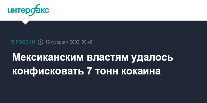Москва. 16 февраля. INTERFAX.RU - Мексиканские ВМС конфисковали 7 тонн кокаина, который переправляли на рыболовецкой шхуне в международных водах Тихого океана, сообщает в понедельник американская телекомпания CNN со ссылкой на представителей военно-морского ведомства Мексики.