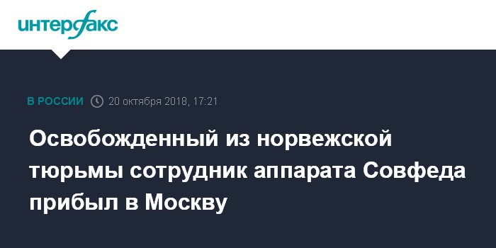 Освобожденный из норвежской тюрьмы сотрудник аппарата Совфеда прибыл в Москву