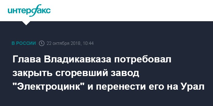 Москва. 22 октября. INTERFAX.RU - Глава Владикавказа Махарбек Хадарцев обратился к руководству завода "Электроцинк", где произошел крупный пожар, с требованием перенести опасное производство на Урал.