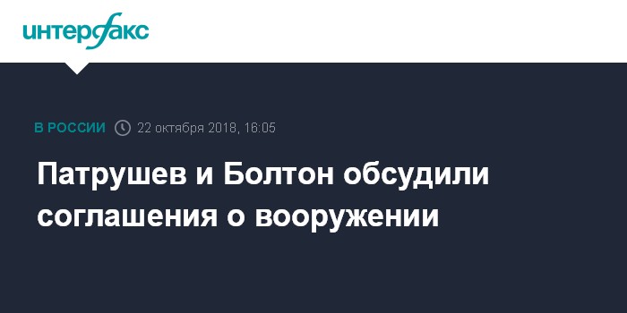 "Болтон начал свою поездку в Москву со встречи с секретарем Совета безопасности РФ Николаем Патрушевым. Они обсудили широкий круг вопросов, включая соглашения о вооружении, Сирию, Иран, Северную Корею и борьбу с терроризмом", - говорится в сообщении американской дипмиссии, опубликованном в твиттере.