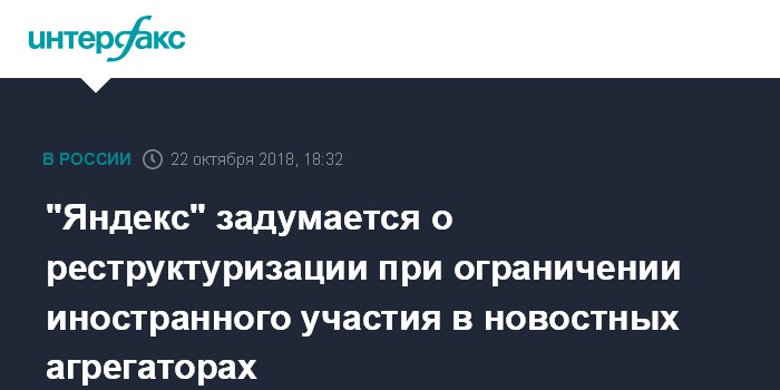 Москва. 22 октября. INTERFAX.RU - Совет директоров "Яндекса" рассмотрит варианты реструктуризации сервиса новостей в случае принятия закона об иностранном участии в новостных агрегаторах. Об этом сообщили "Интерфаксу" в понедельник в пресс-службе компании.