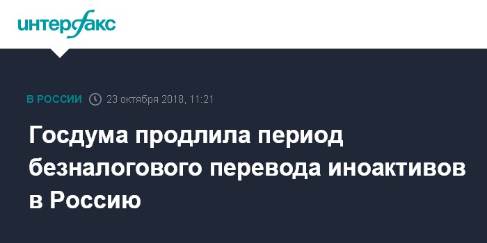 Москва. 23 октября. INTERFAX.RU - Госдума на заседании во вторник приняла правительственный закон, который призван стимулировать безналоговый перевод физическими лицами в Россию иностранных активов.