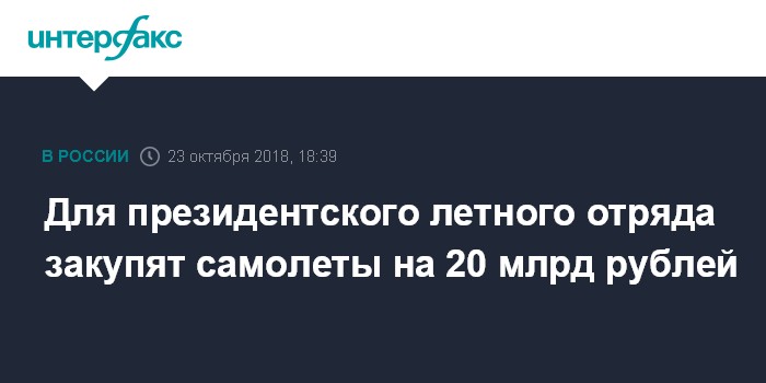 Москва. 23 октября. INTERFAX.RU - Более 20,8 млрд рублей могут дополнительно внести в федеральный бюджет-2018 на обновление и модернизацию парка ФГБУ "Специальный летный отряд "Россия" - структуры Управления делами президента РФ, занимающейся авиаперевозками первых лиц страны.