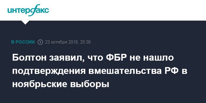 Москва. 23 октября. INTERFAX.RU - США пока не фиксируют никаких фактов вмешательства со стороны РФ в связи с грядущими промежуточными выборами в стране в ноябре, заявил помощник президента США по национальной безопасности Джон Болтон.