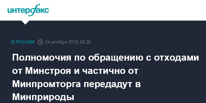 Москва. 24 октября. INTERFAX.RU - Минприроды перейдут полномочия Минстроя в сфере госполитики и управления в области обращения с твердыми коммунальными отходами (ТКО), а также частично будут переданы функции Минпромторга в этой области, пишет газета "Коммерсант" в среду.