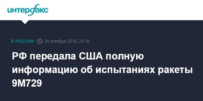 Москва. 24 октября. INTERFAX.RU - Россия предоставила американской стороне всю информацию о запусках ракеты 9М729, заявил замглавы МИД РФ Сергей Рябков.
