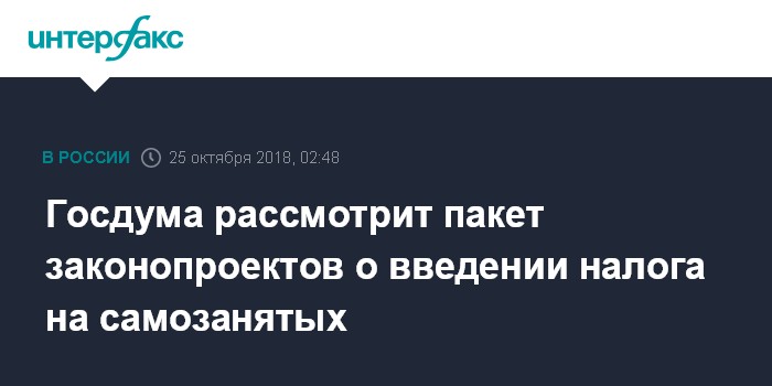 Москва. 25 октября. INTERFAX.RU - Госдума РФ на заседании в четверг планирует рассмотреть в первом чтении пакет законопроектов о введении налога на профессиональный доход.
