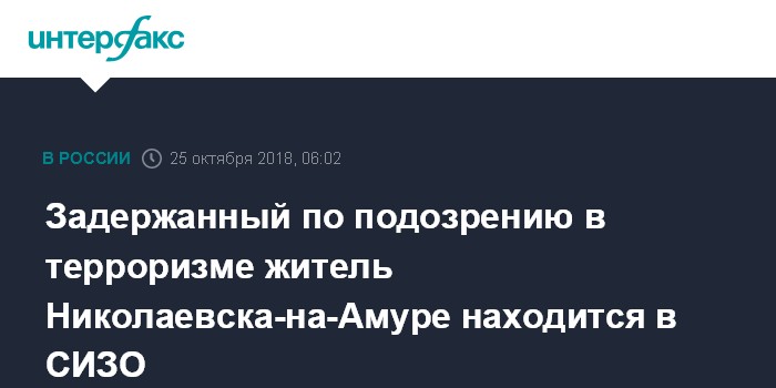 Москва. 25 октября. INTERFAX.RU - Мужчина, которого сотрудники УФСБ по Хабаровскому краю задержали по подозрению в терроризме, в настоящее время находится в Хабаровском СИЗО, сообщил агентству "Интерфакс" источник, знакомый с ситуацией.