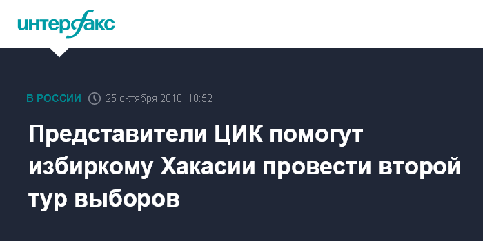 "25 октября 2018 года представители ЦИК России выехали в Республику Хакасия для оказания организационно-методической помощи республиканскому избиркому при проведении повторного голосования на выборах Главы Республики Хакасия 11 ноября", - говорится в сообщении пресс-службы Центризбиркома в четверг.