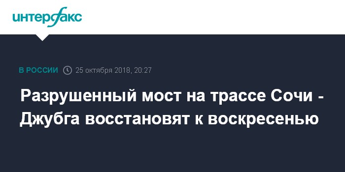 Москва. 25 октября. INTERFAX.RU - Движение по федеральной трассе А147 Джубга - Сочи, на которой в результате паводка обрушился мост через реку Макопсе, восстановят в субботу, заявляет подведомственное Росавтодору Федеральное казенное учреждение Упрдор "Черноморье", которое ведет ремонтные работы.