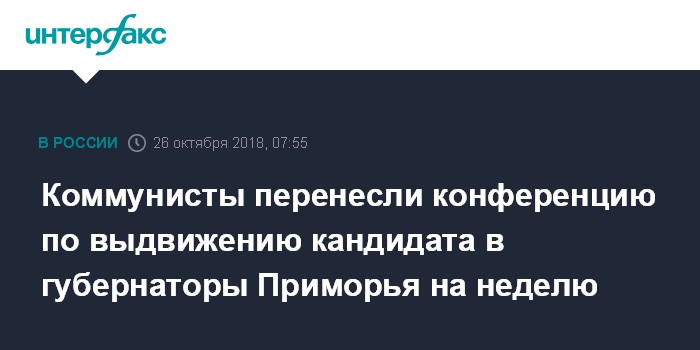 "Конференцию с 27 октября переносят на следующую субботу, 3 ноября. Теряем неделю", - сообщил агентству "Интерфакс" член комитета Приморского краевого отделения КПРФ, депутат Законодательного собрания Приморья Владимир Беспалов.