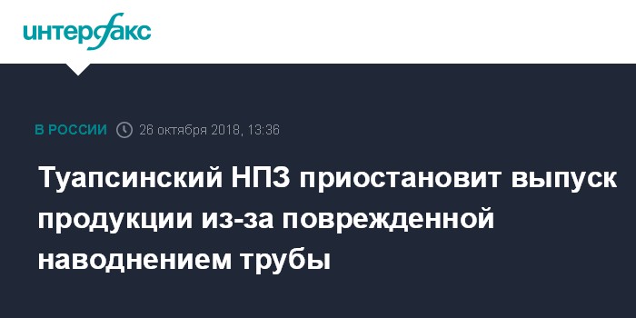 Москва. 26 октября. INTERFAX.RU - Туапсинский НПЗ "Роснефти" вынуждено приостановит выпуск продукции и перейдет на горячую циркуляцию из-за повреждения селевым потоком трубопровода Тихорецк-Туапсе-1 "Транснефти", сообщила пресс-служба завода.