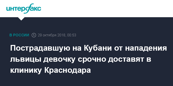 Москва. 29 октября. INTERFAX.RU - Девочке, пострадавшую от нападения львицы в передвижном цирке на Кубани, окажут необходимую высококвалифицированную медпомощь в клинике Краснодара, сообщили агентству "Интерфакс" в пресс-службе администрации края.
