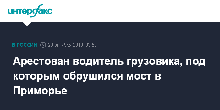 Москва. 29 октября. INTERFAX.RU - Водитель большегрузного автомобиля, после проезда которого в пятницу рухнул мост через реку Осиновка в Приморье и погибли два человека, взят под стражу.