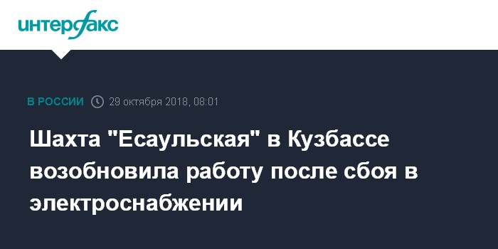 Москва. 29 октября. INTERFAX.RU - Шахта "Есаульская" возобновляет добычу после нарушения электроснабжения, сообщили "Интерфаксу" в департаменте угольной промышленности администрации Кемеровской области.