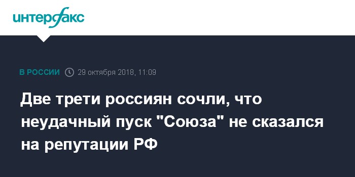 83% опрошенных сообщили социологам, что слышали о неудачном запуске ракеты "Союз" 11 октября. Большинство россиян, как показали данные опроса, считают, что у России сильные позиции в освоении космоса. 38% опрошенных полагают, что позиции сохранены, а треть (34%) респондентов считает, что они усилены. Менее четверти россиян (23%) считают, что позиции потеряны.