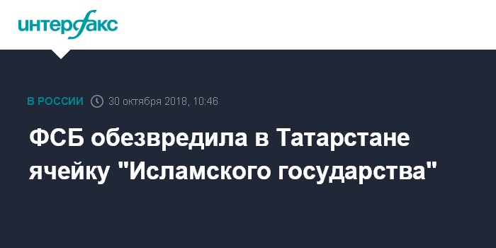 Москва. 30 октября. INTERFAX.RU - ФСБ России сообщает о пресечении деятельности в Татарстане террористической ячейки, члены которой планировали резонансные акции на территории РФ, занимались вербовкой сторонников из числа радикальной молодежи.
