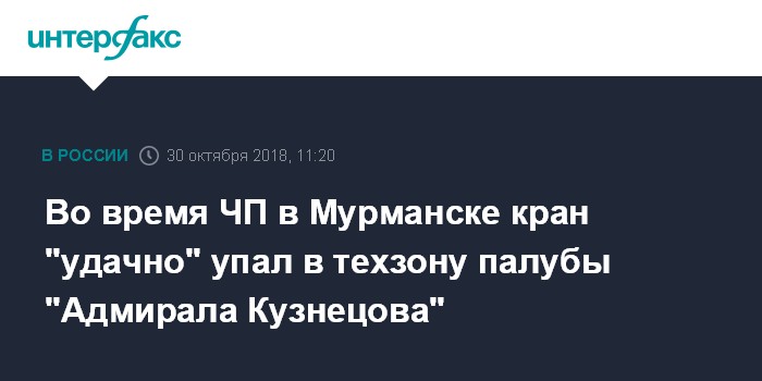 Москва. 30 октября. INTERFAX.RU - Во время происшествия на плавдоке в Мурманске один из кранов упал на летную палубу тяжелого авианесущего крейсера "Адмирал Кузнецов", сообщил "Интерфаксу" источник в судостроительной отрасли.