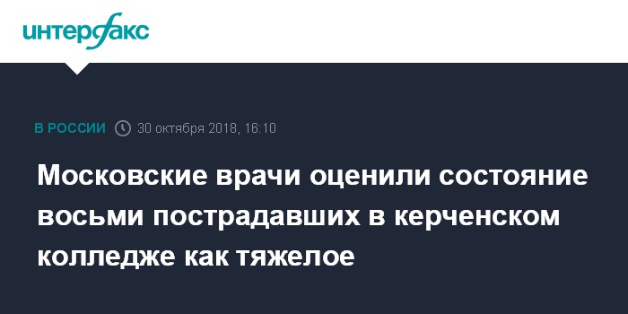 Москва. 30 октября. INTERFAX.RU - Восемь учащихся, пострадавших в результате стрельбы и взрыва в керченском колледже, остаются в тяжелом состоянии в московском Центре доктора Рошаля, сообщается на сайте уполномоченного по правам ребенка Анны Кузнецовой.