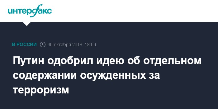 Москва. 30 октября. INTERFAX.RU - Президент России Владимир Путин согласился обдумать идею отдельного содержания осужденных за терроризм в местах лишения свободы, чтобы не допускать пропаганды радикальных идей среди других заключенных.