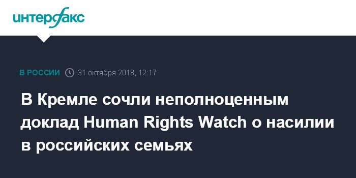 Москва. 31 октября. INTERFAX.RU - Доклад правозащитной организации Human Rights Watch о насилии в российских семьях базируется на беседе с десятками женщин, поэтому не может претендовать на полноценное исследование ситуации в стране, заявил пресс-секретарь президента РФ Дмитрий Песков.