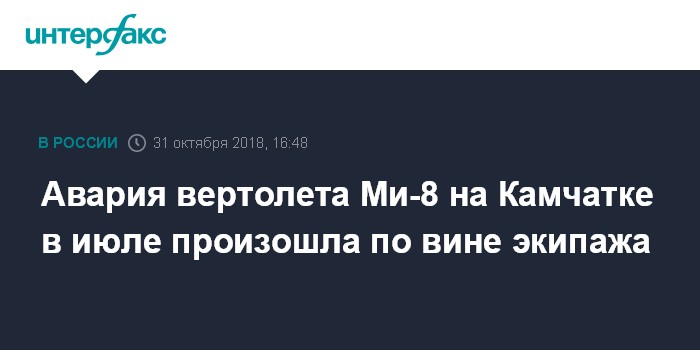 Москва. 31 октября. INTERFAX.RU - Расследование аварии вертолета Ми-8 авиапредприятия "Ельцовка", которая произошла летом на Камчатке, установило вину экипажа, следует из материалов Западно-Сибирского теруправления Росавиации.