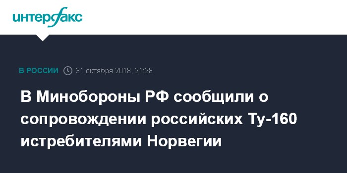 Москва. 31 октября. INTERFAX.RU - Норвегия поднимала в воздух истребители для сопровождения двух российских стратегических ракетоносцев Ту-160, которые пролетели над нейтральными водами Баренцева и Норвежского морей, сообщили в среду в Минобороны РФ.