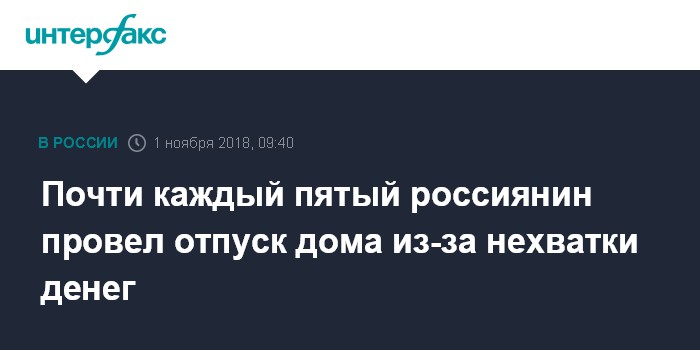 Москва. 1 ноября. INTERFAX.RU - Почти каждый пятый россиянин провел свой летний отпуск дома из-за отсутствия средств на туристические поездки, свидетельствуют данные опроса "Левада-центра", поступившие в четверг в "Интерфакс".