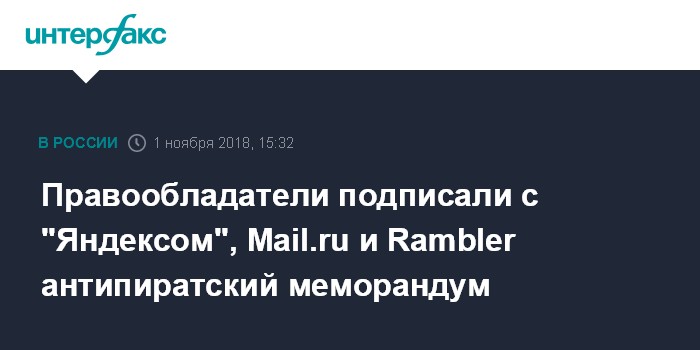 Москва. 1 ноября. INTERFAX.RU - Правообладатели подписали с "Яндексом", Mail.ru и Rambler меморандум по совместной борьбе с пиратством, передает корреспондент "Интерфакса".