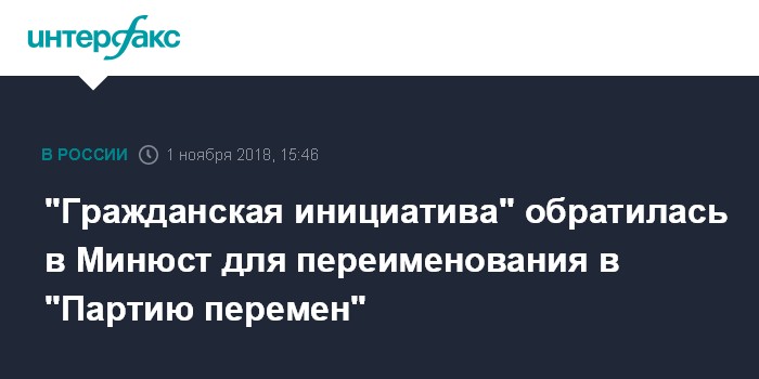 Москва. 1 ноября. INTERFAX.RU - Представители партии "Гражданская инициатива" подали в Минюст документы о переименовании в "Партию перемен".
