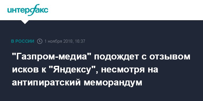 "Газпром-медиа" подождет с отзывом исков к "Яндексу", несмотря на антипиратский меморандум